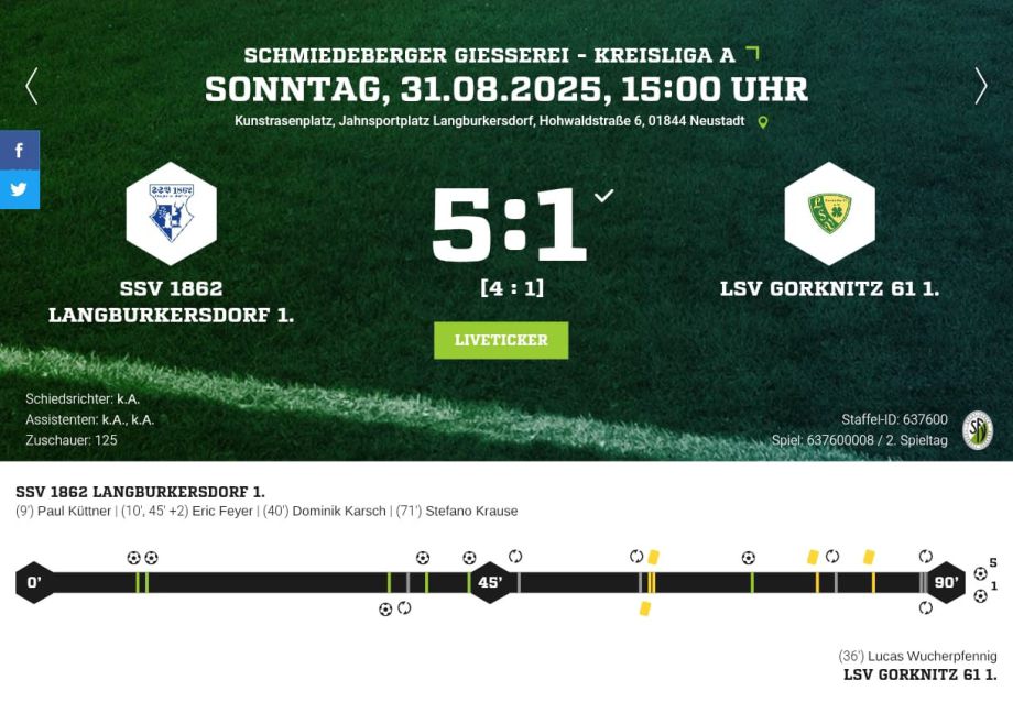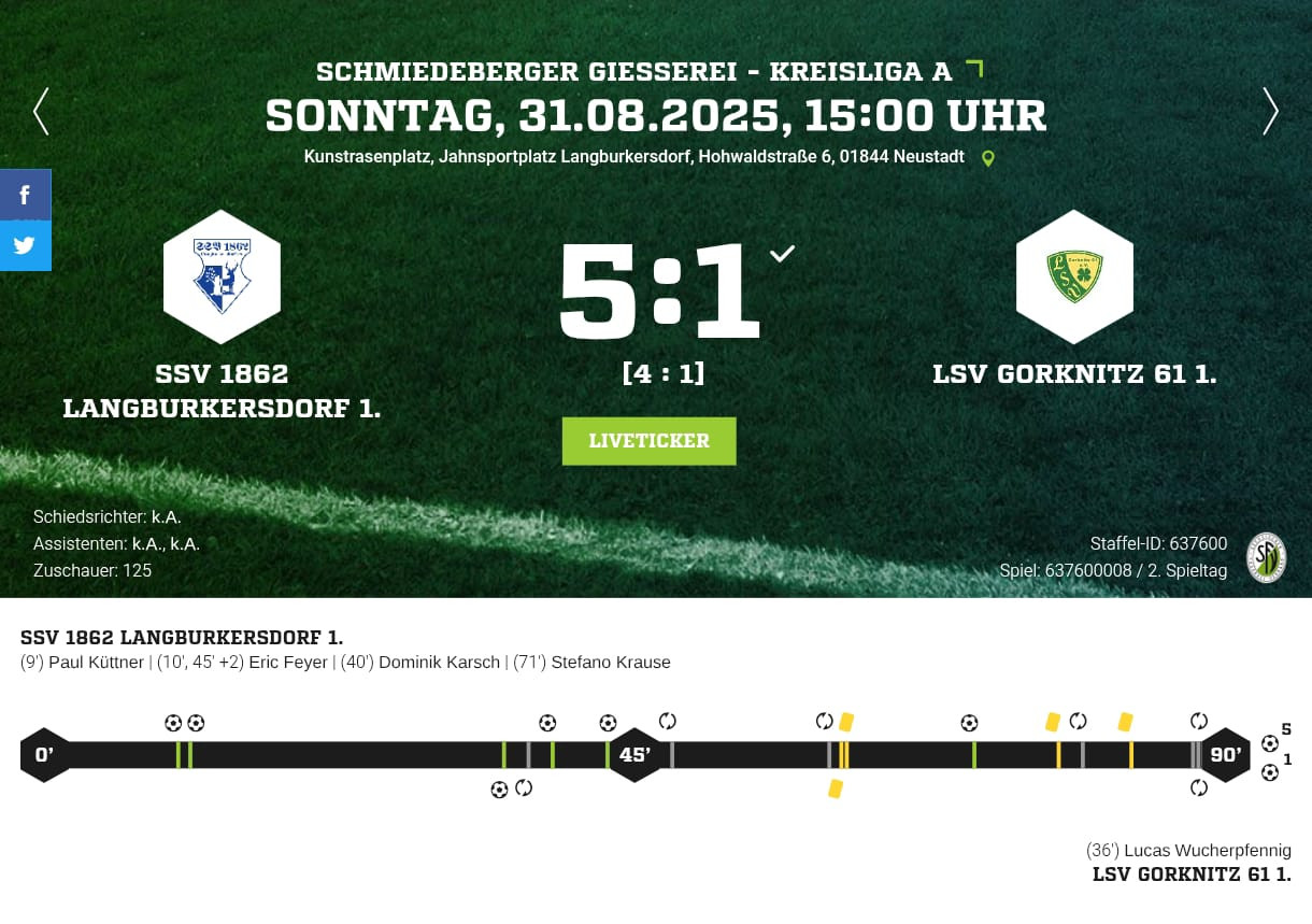 Im Spiel passierte bis zur 75. Minute weiterhin nicht viel. Alexander Menyhei konnte an der Mittellinie einen hohen Ballgewinn erzielen und diesen mittels Steckpass gleich an Dominik Karsch weiterverteilen. Dieser war im Anschluss an einen Standard noch vorn geblieben und konnte den Ball perfekt in die Mitte auf Krause legen. Dieser konnte sich nun mit einem Tor auch noch selbst belohnen. Danach ließ man nichts mehr zu. E. Feyer vergab noch einmal eine gute Chance und somit blieb es bis zum Schluss beim 5:1 für unsere Langburkersdorfer Jungs.