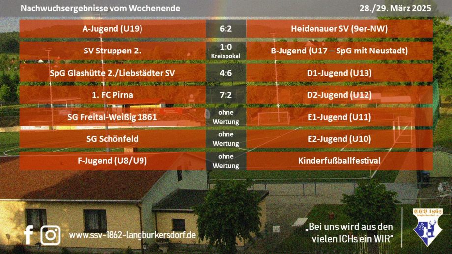 Das letzte Wochenende brachte für unsere Nachwuchsmannschaften des SSV 1862 Langburkersdorf viele Tore, spannende Spiele und wichtige Entwicklungsschritte in allen Altersklassen.