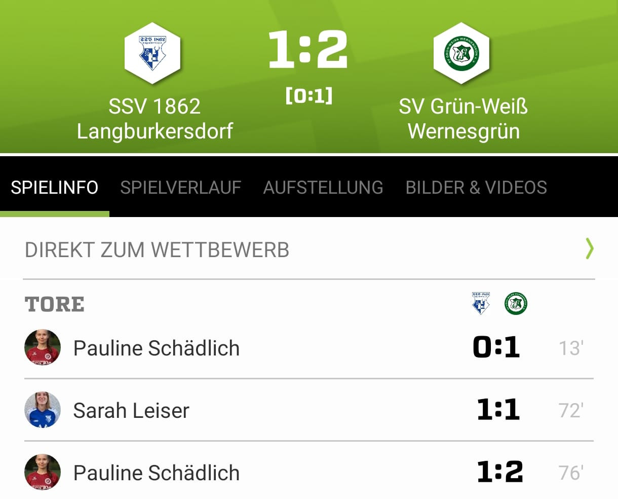 Wernesgrün ging zunächst in Führung, doch wir schlugen durch Sarah Leiser zurück und erzielten den Ausgleich. Leider trafen die Gastgeberinnen kurz darauf erneut – und dieser Treffer blieb am Ende entscheidend.