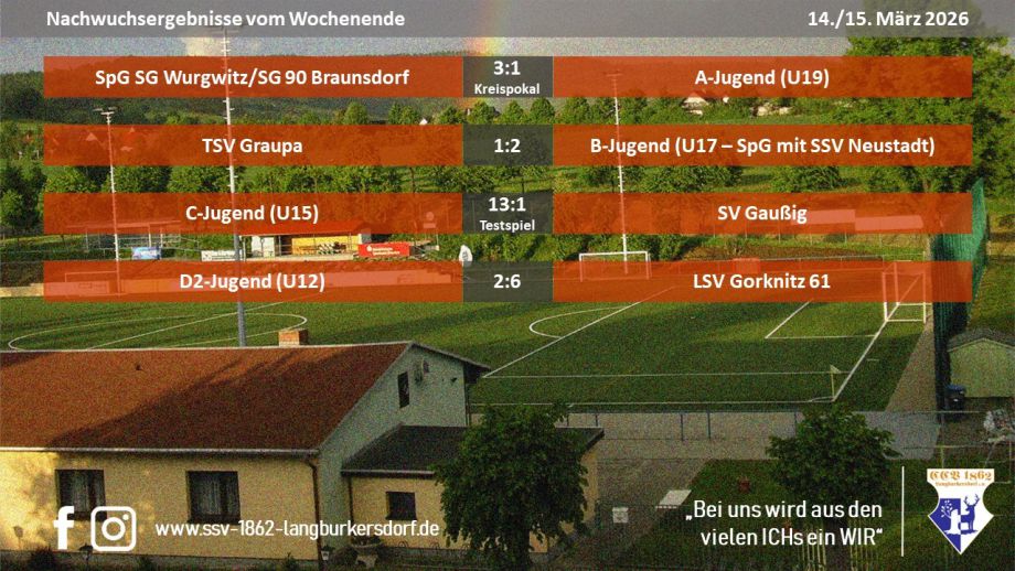 Ein intensives Fußballwochenende liegt hinter den Nachwuchsteams unseres SSV 1862 Langburkersdorf – mit einem Pokalhalbfinale, wichtigen Punkten in der Meisterrunde und einem torreichen Testspiel.